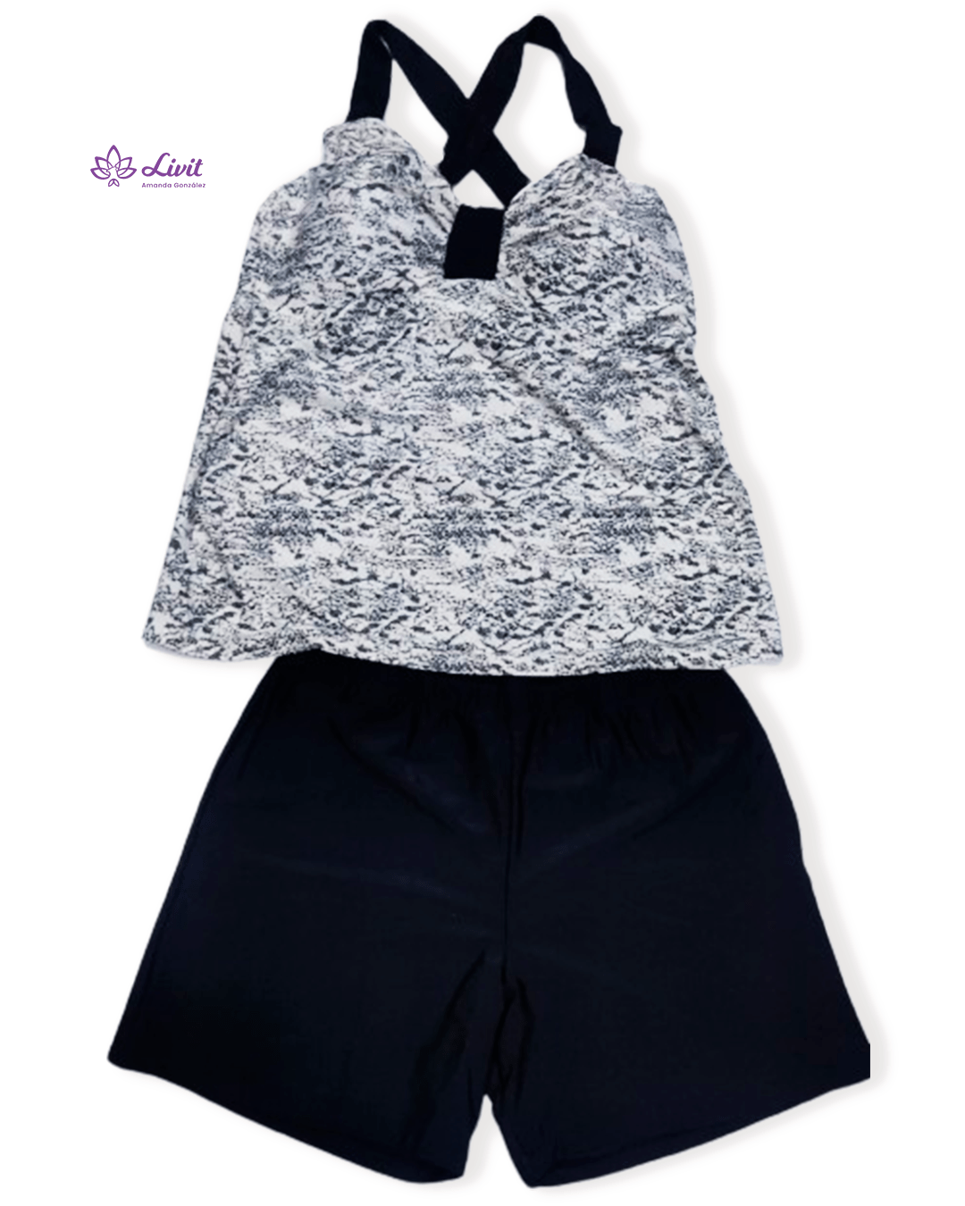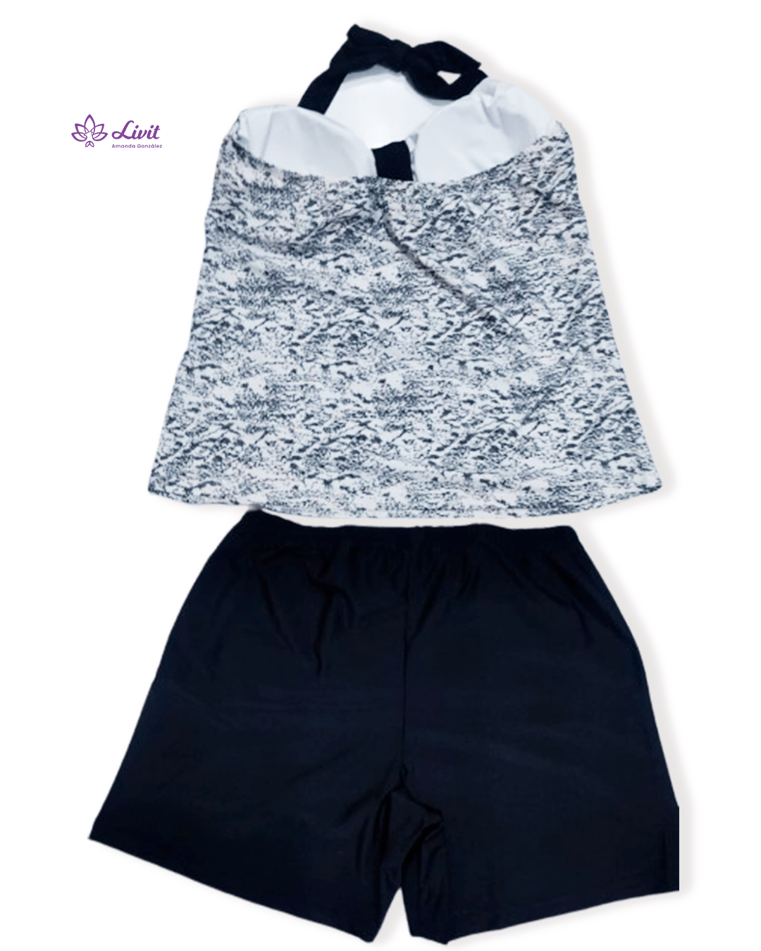 Disfruta de tus días de descanso en la playa o el balneario con este cómodo y discreto vestido de baño de dos piezas. En la parte superior un hermoso top de talle alto y buena cobertura en la zona abdominal. En la parte superior, un confortable Short que, junto al top, podrás usas como ropa exterior.