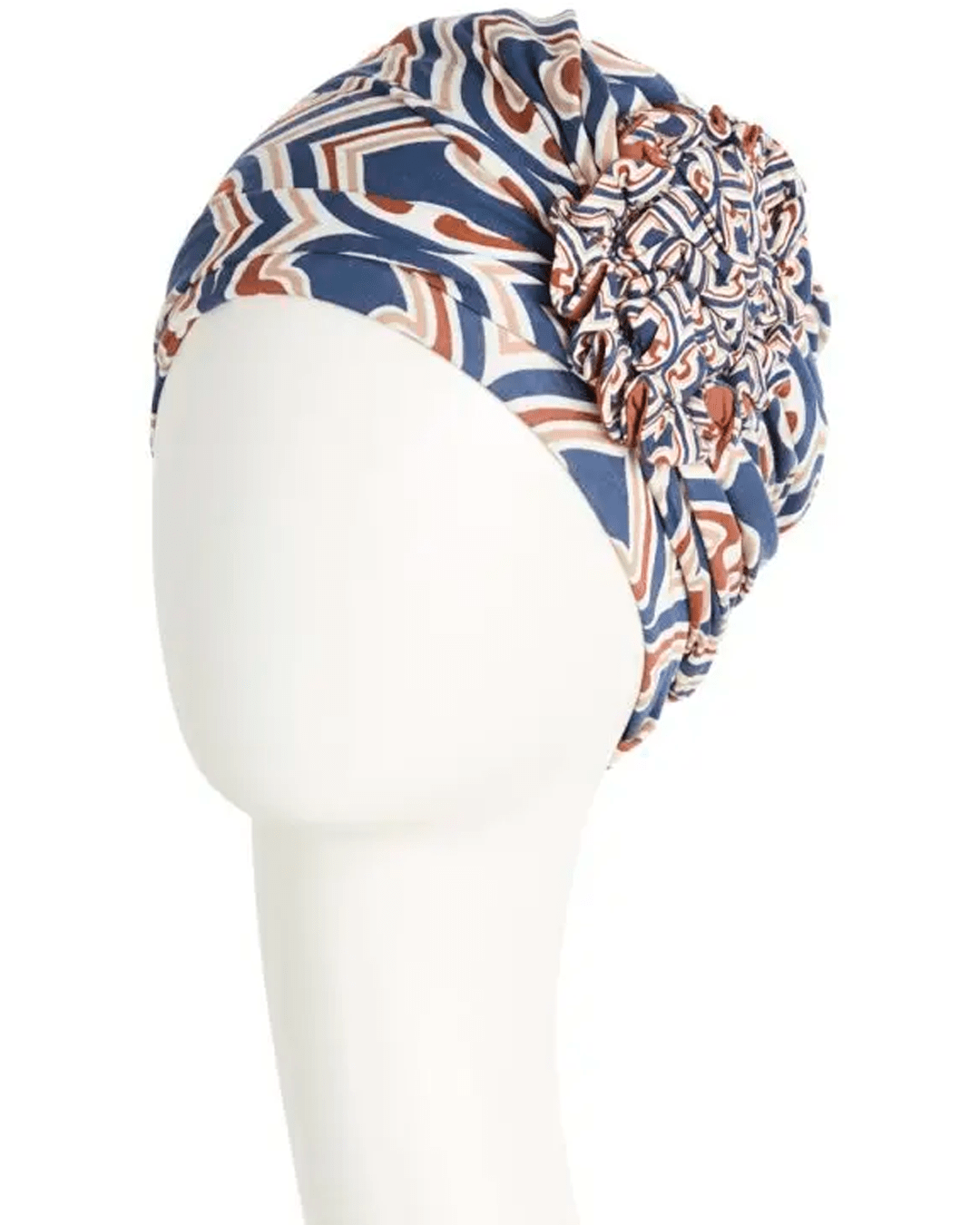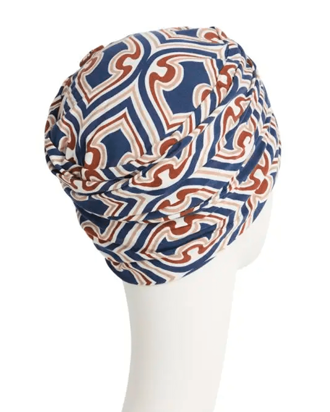 El hermoso y versátil turbante Lotus de Christine Headwear en una encantadora mezcla de colores en tonos azules y marrones.